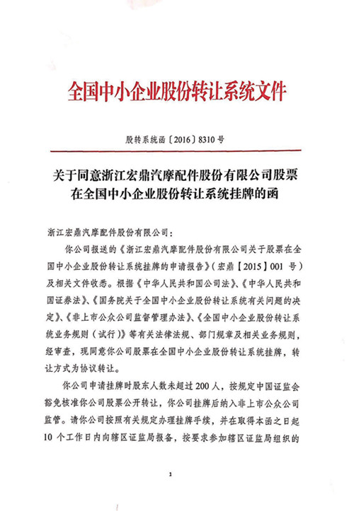 關(guān)于同意浙江宏鼎汽摩配件股份有限公司股票在全國中小企業(yè)股份轉(zhuǎn)讓系統(tǒng)掛牌的函